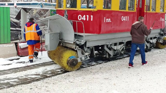 Работа специальной техники по очистке от снега трамвайных путей в столице.