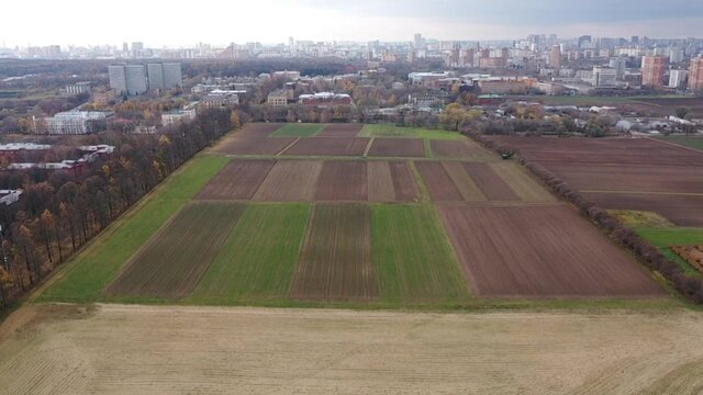 Вид с квадрокоптера на опытные поля Тимирязевской сельскохозяйственной академи в Северном административном округе столицы.