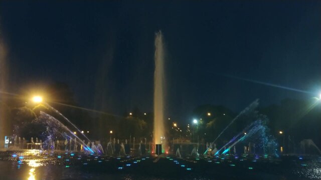 Работа нового светомузыкального фонтана на обновленной площади Павелецкого вокзала