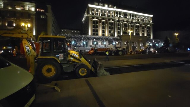 Ночные работы по укладке асфальта на Новой площади в центре Москвы