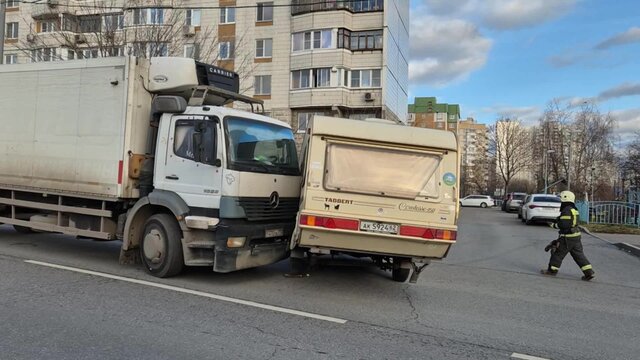 На юге Москвы ликвидируют последствия ДТП. На Варшавском шоссе, на пересечение с улицей Сумская, грузовик «МАЗ» врезался в столб. В результате аварии столб накренился под 45 градусов и завис над Варшавском шоссе, также были снесены шкафы управления светофорами на перекрёстке. Кабина грузовика сильно деформировалась. Водитель не получил травм и отделался легким испугом. В результате аварии, движение оказалось сильно затруднено.