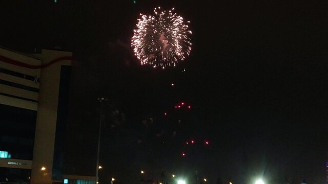 Салют в честь Дня защитника Отечества 23-го февраля на Поклонной горе на западе Москвы.