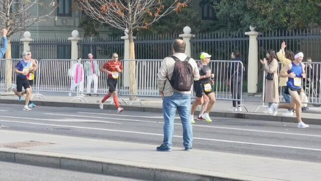 Участники Московского Марафона на Тверской улице в центре Москвы.