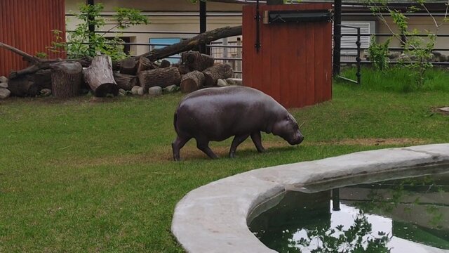 Карликовый бегемот Ксюша в тёплом вольере Московского зоопарка.