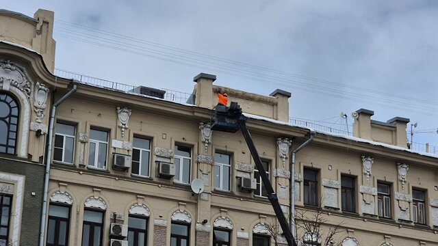 Чистка крыши дома от снега на улице Арбат в центре Москвы