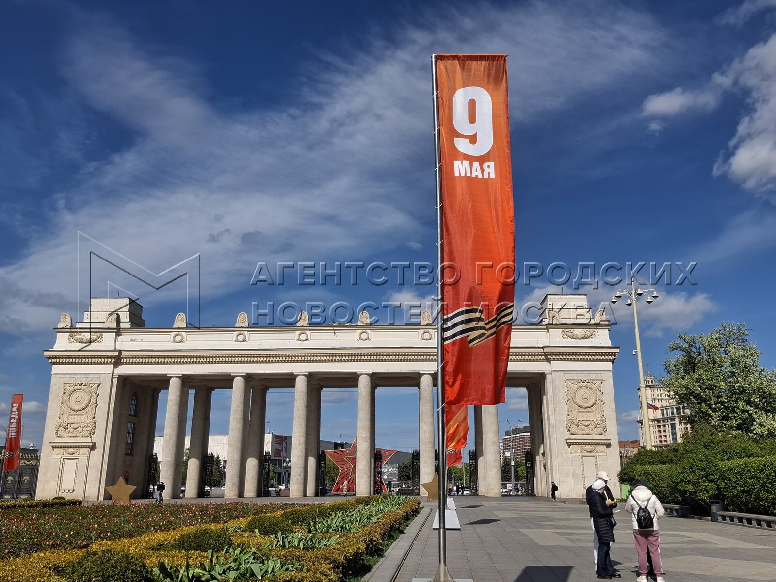 В центре Москвы главный вход в Парк Горького празднично оформили ко Дню Победы.