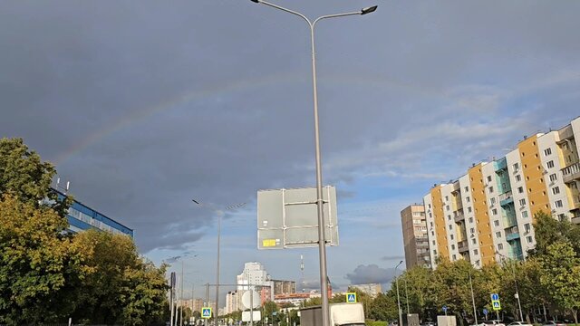 В центре Москвы вечером после кратковременного дождя на небе появилась радуга.