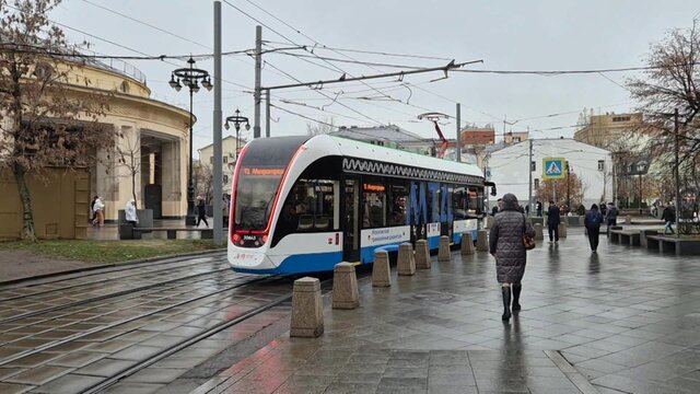 Зелёная подсветка на автономных трамваях нового поколения 90-ого маршрута в центре столицы.