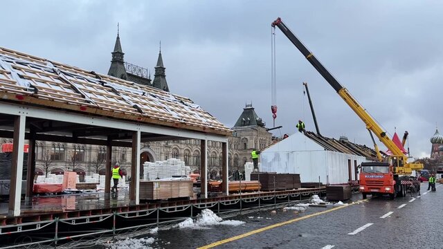 Монтаж зимнего катка в парке Северного речного вокзала на севере Москвы.
