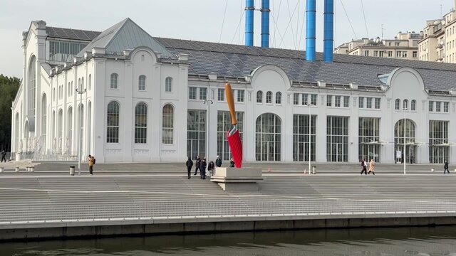 Арт-объект "Садовая лопатка" работы Класа Олденбурга и Кошье ван Брюгген на Болотной набережной вызывает интерес у горожан