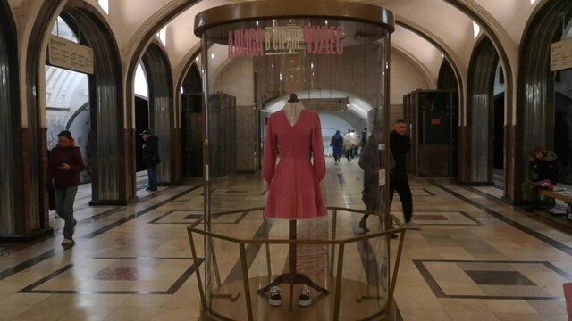 Платья героинь фильма «Алиса в Стране чудес» представили на станциях метро «Маяковская» и «Белорусская» Замоскворецкой линии.