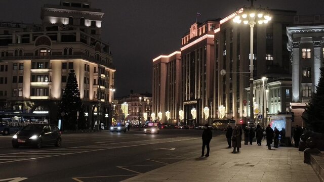 Подсветка фасадов строящихся зданий в цветах российского флага.