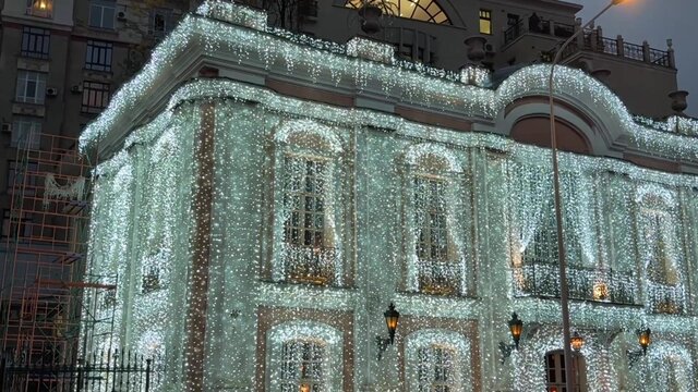 Фасад бизнес-центра, украшенный светодиодным антуражем на ул. Воронцовская в центре Москвы