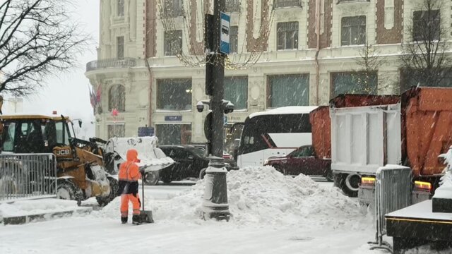 Снегоуборочная техника вышла на улицы Москвы во время снегопада. Проводится уборка снега на проезжей части дороги.