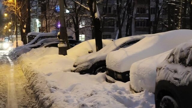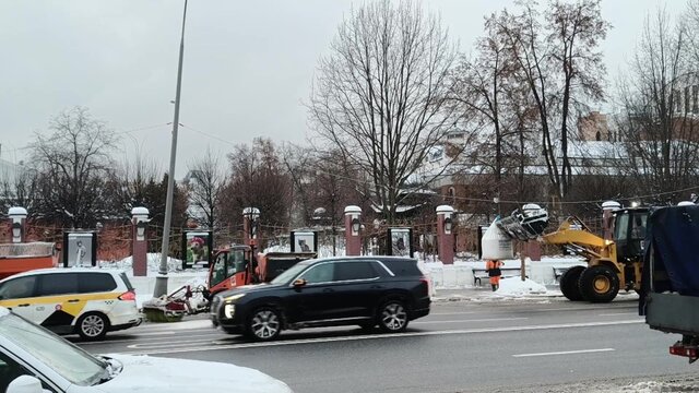 Работа коммунальных служб по уборке снега с кровель зданий в центре Москвы