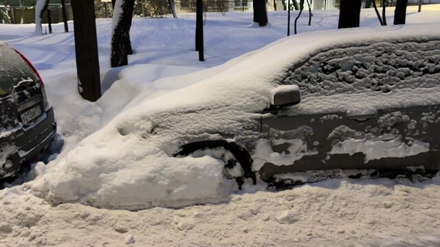 Заснеженные припаркованные автомобили на улицах Москвы после обильного снегопада.