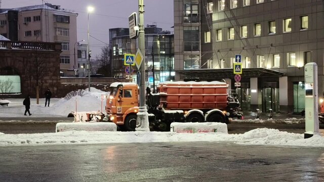 Коммунальные службы продолжают работы по уборке улиц после обильного снегопада в Москве. Дороги и магистрали убирают методом сплошного прометания и обрабатывают противоголедными материалами.