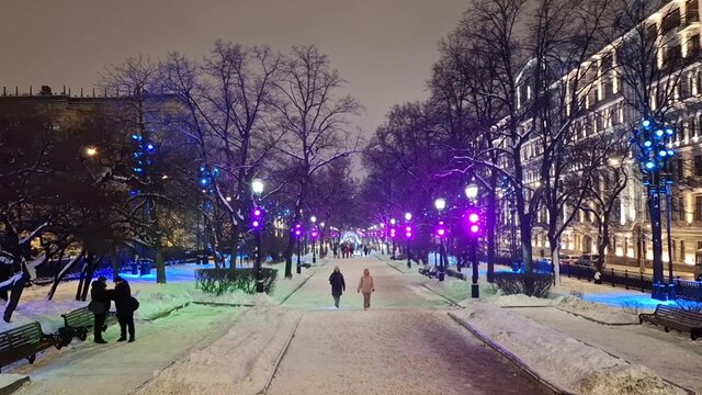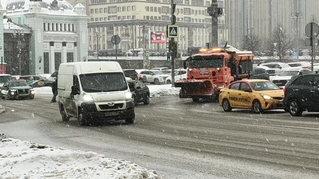 Вечернее прометание и обработка улиц противогололедными материалами коммунальной техникой в центре Москвы.