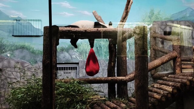 Панда Катюша ест под елочкой вкусняшки, спрятанные киперами в вольере Московского зоопарка