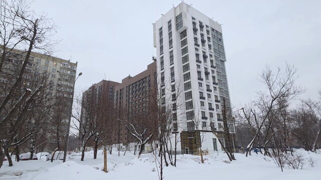 Детская и спортивная площадки на территории жилых домов, построенных по программе реновации на Судостроительной улице.
