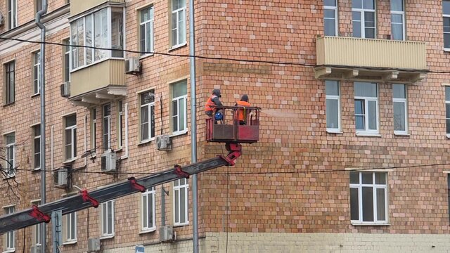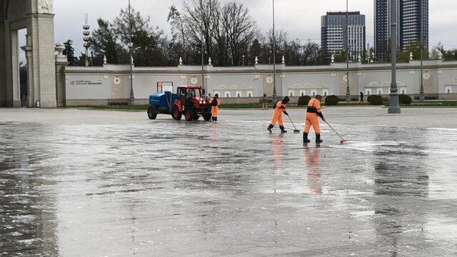 Промывка монумента "Покорителям космоса" на Аллее Космонавтов на ВДНХ.