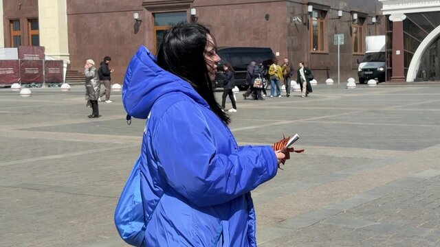 Волонтёры Москвы приняли участие в акции «Георгиевская лента» на ул. Арбат. С 23 по 26 апреля, а также с 30 апреля по 1 мая в столице проходит всероссийская акция «Георгиевская лента». В городских парках, на центральных улицах города, около станций метрополитена волонтёры Москвы раздают горожанам и гостям столицы георгиевские ленты и листовки с правилами их ношения. Пресс-подход Екатерины Драгуновой, председателя Комитета общественных связей и молодёжной политики города Москвы.