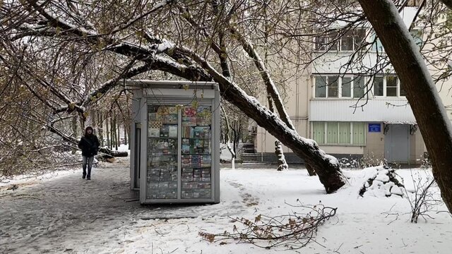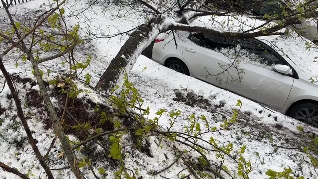 Устранение коммунальными службами последствий падения нескольких деревьев на ул. Чертановская на юге Москвы.