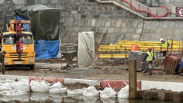 В центре Москвы полным ходом продолжаются работы по строительству пешеходного моста, который станет связующим звеном между прогулочными пространствами возле ГЭС-2 и сквером Репина на Болотной набережной.