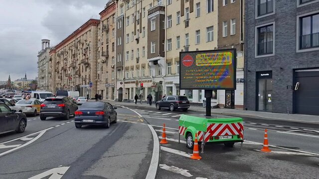 Передвижной медиа-экран ЦОДД с сообщением о перекрытии движения в связи с репетицией Парада Победы