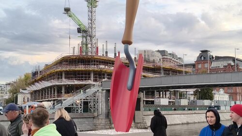 Арт-объект "Садовая лопатка" работы Класа Олденбурга и Кошье ван Брюгген на Болотной набережной вызывает интерес у горожан
