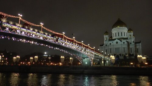 Вечерняя разноцветная динамическая подсветка Патриаршего моста