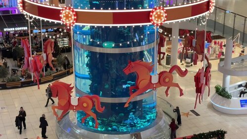 Самый высокий цилиндрический аквариум в ТРЦ «Авиапарк» украсили фигурами лошадей и гирляндами