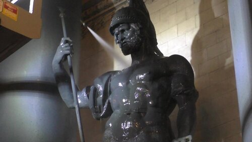 Вид с квадрокоптера и с земли на работы по промывке Триумфальной арки на Кутузовском проспекте