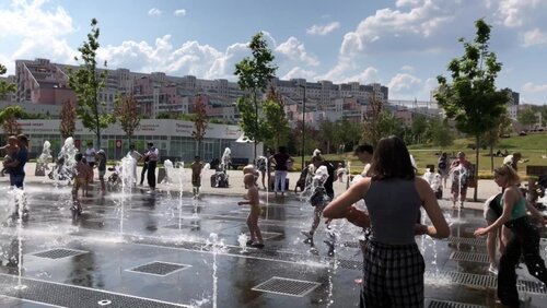 Отдых горожан в жару у "сухого" фонтана на Ходынском поле