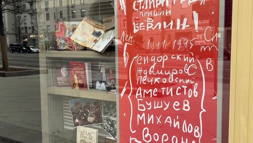 Оформление витрины книжного магазина ко Дню Победы на улице Тверская