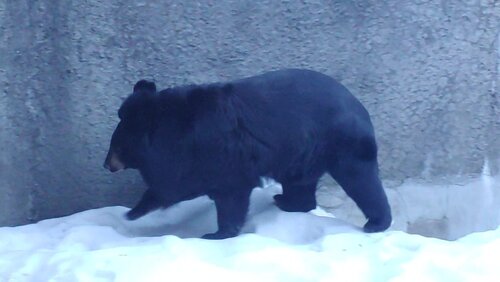 Гималайский медведь в Московском зоопарке радуется выпавшему сегодя снегу