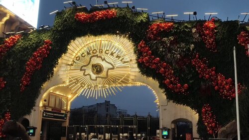 Главный вход Московского зоопарка украсили гирляндами из больших новогодних шаров