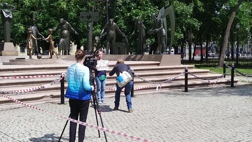 Пикет в поддержку сестер Хачятурян у скульптурной композиции "Дети - жертвы пороков взрослых"