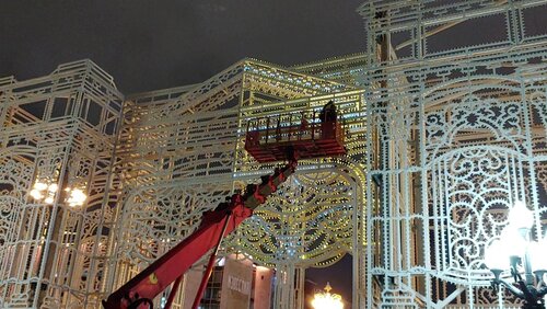 Монтаж световых конструкций на Никольской улице в центре Москвы