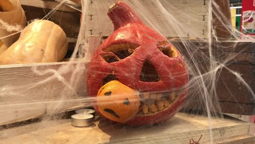 Арт-объект из тыкв с глазами в предверии Хэллоуина появился в одном столичном супермаркете